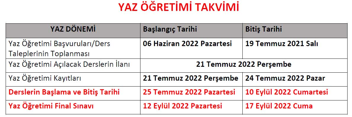Yaz Öğretimi başvuru takvimi aşağıda yer almaktadır. OIS üzerinden ders başvurusu yaparak eğitim ücretini yatıranların başvuruları değerlendirmeye alınacaktır.