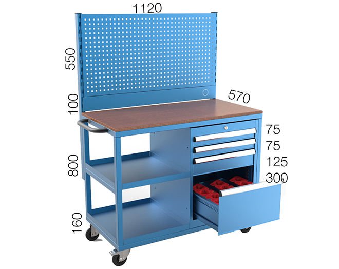 4 çekmeceli, enalt çekmecesinde 12 CNC tutuculu ve askı panolu takım arabası