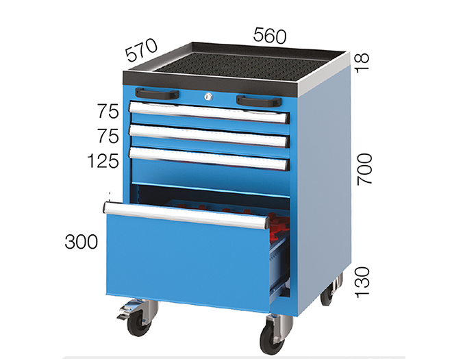 2 sabit, 1 dönerli, 1 frenli dönerli tekerleklidir. Çekmece içleri 450x450 mm ve merkezi kilitlidir. 2 itme kulpludur. Üst tabla siyah alüminyum çerçeveli havuzludur.