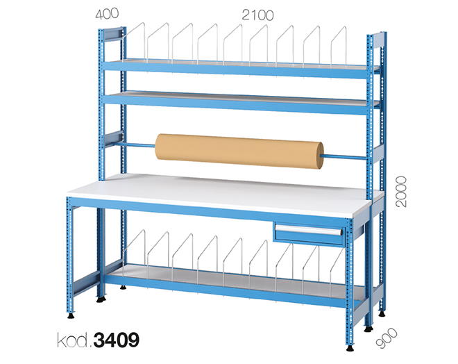 Masa üstünde 1 adet rulo askılığı vardır. 1 adet 440x440 mm çekmece, 1 adet 400x2000 mm sabit raf, 2 adet 400x2000 mm seperatörlü raflıdır.