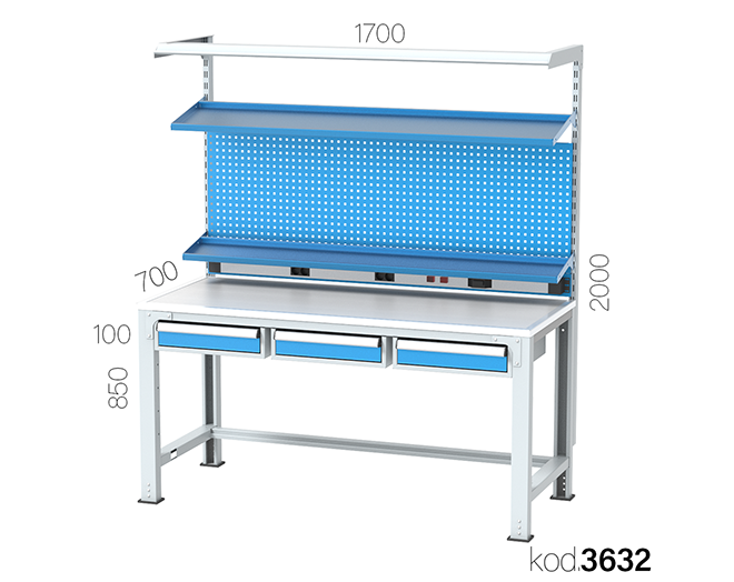 3 çekmeceli, askı panolu ve aydınlatmalı çalışma tezgahı
