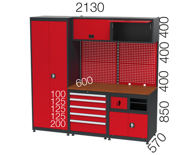1 tam boy dolap ve 3 adet yarım dolaplı, 5 çekmeceli ve askı panolu garaj dolabı
