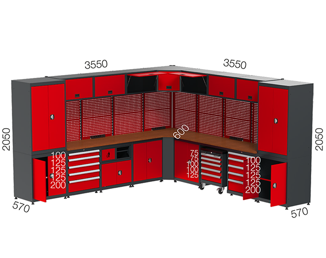 14 adet dolap bulunmaktadır., 15 adet çekmece, askı panolu ve takım arabalı garaj dolabı