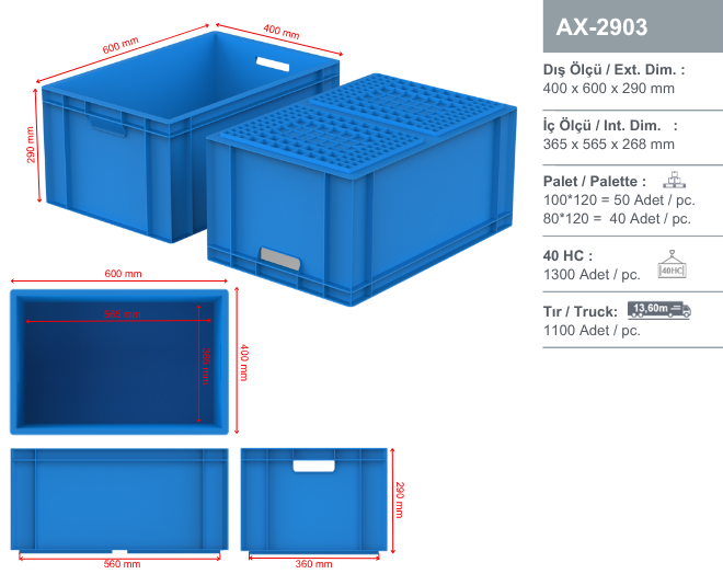 | DIŞ ÖLÇÜLER | : | 400 | X | 600 | X | 290 mm |