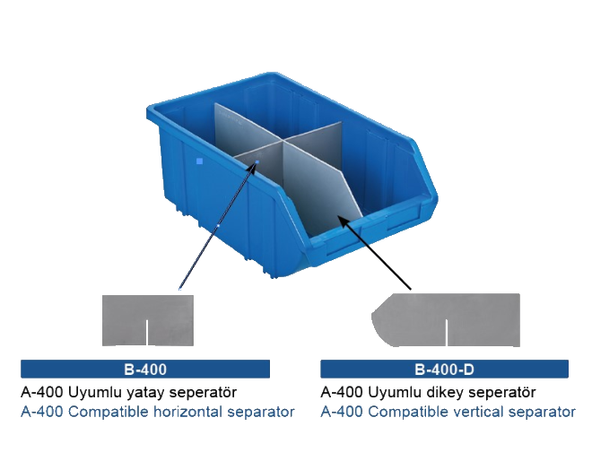 B-400 Seperatör ile A-400 Avadanlıkları yatay olarak ortadan ikiye ayırabilirsiniz. B-400 D ile birlikte avadanlığı 4 bölüme ayırabilirsiniz.