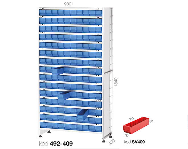 Galvanized cabinet with 150 piece plastic shelf bins.