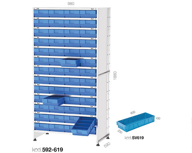 Galvanized cabinet with 52 piece plastic shelf bins.