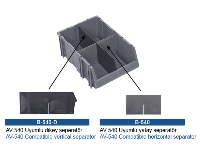 With the B-540-D Separator, you can divide the AV-540 Stacking Bins in two horizontally. With the AV-540, you can divide the stacking bin to 4 sections.