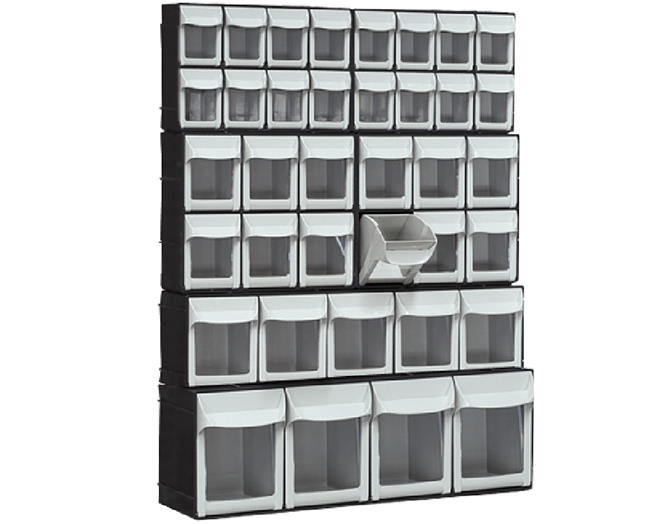Plastic drawer boxes facilitate storage and stock control as well as shorten the assembling processes.