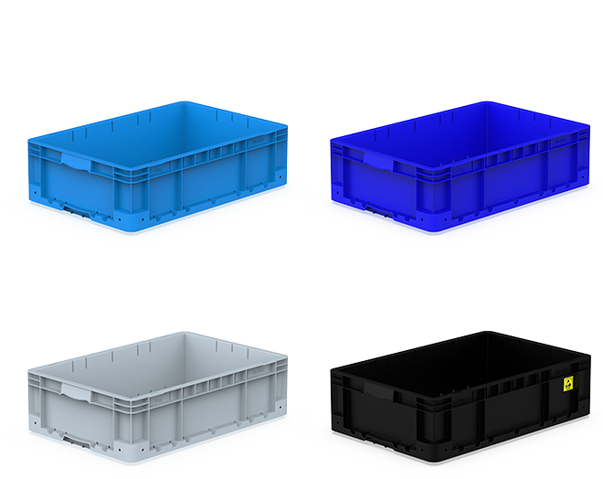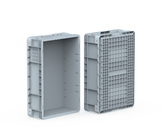 Plastic crate with closed sides and bottom.