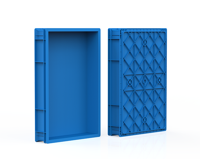 Plastic crate, ribbed base with closed sides and bottom.