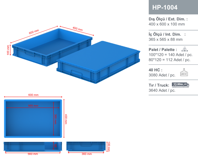 Offering high durability in logistics, production, and storage areas, the 400x600 mm plastic enclosed crate protects its contents against external factors thanks to its enclosed handle. Its ribbed base provides strength for heavy loads and its stackable structure saves space.