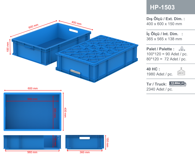 Offering high durability in logistics, production, and storage areas, the 400x600 mm plastic enclosed crate protects its contents against external factors thanks to its enclosed handle. Its ribbed base provides strength for heavy loads and its stackable structure saves space.