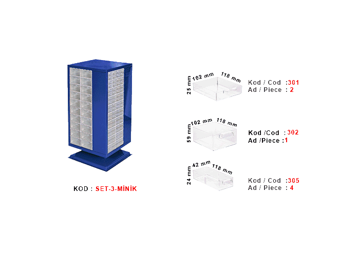 Drawer cabinets that can rotate around the axis. Are mainly used at factories, workshops, manufacturing-assembly lines, and hardware stores for easy access of small items such as screws, nails, needles, beads and so on.