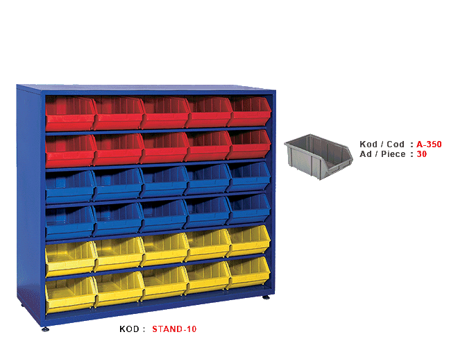 STAND-10 WIDTH SIZE LOAD EXTERNAL DIMENSIONS : 1400 X 450 X 1200 mm A-350 STACKING BINS : 30 PIECES Product Color Options :