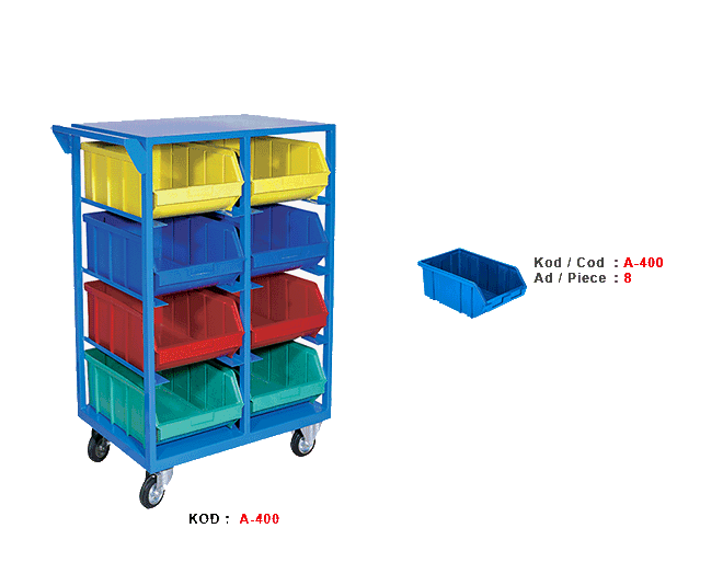TRA-400 WIDTH SIZE LOAD EXTERNAL DIMENSIONS : 690 X 470 X 1120 mm A-400 STACKING BINS : 8 PIECES Product Color Options :