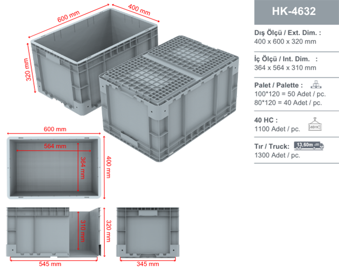 Plastik yanları ve altı kapalı kasa Dış ebatları: 400x600x320 mm