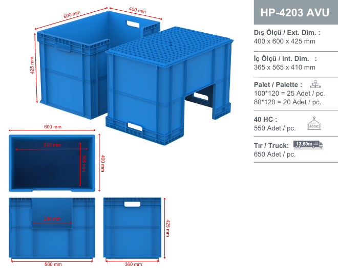 Dış ebatları: 400 x 600 x 425 mm, İç ebatlar:365 x 565 x 410 mm
