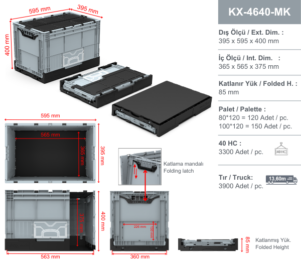 Plastik Katlanır ve kapaklı kasa 395 x 595 x 400 mm