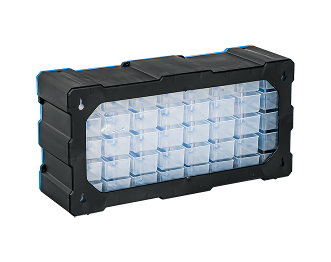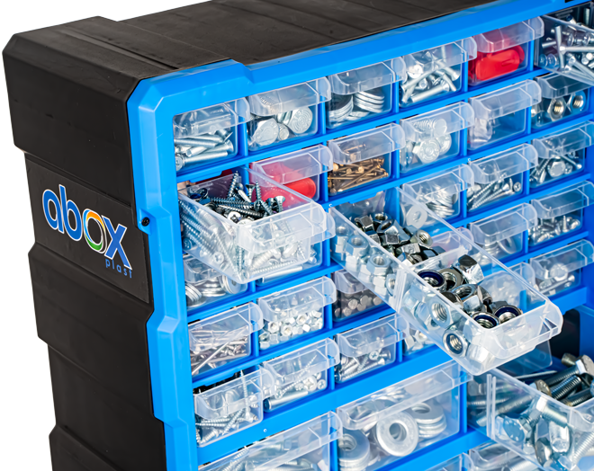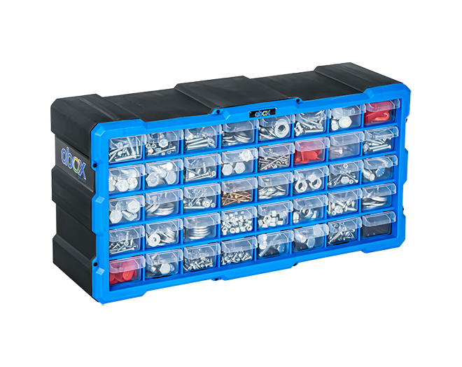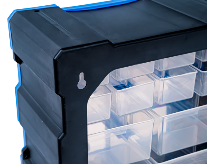 Renk: Gövde siyah, ön çerçeve mavi ve çekmeceler şeffaf